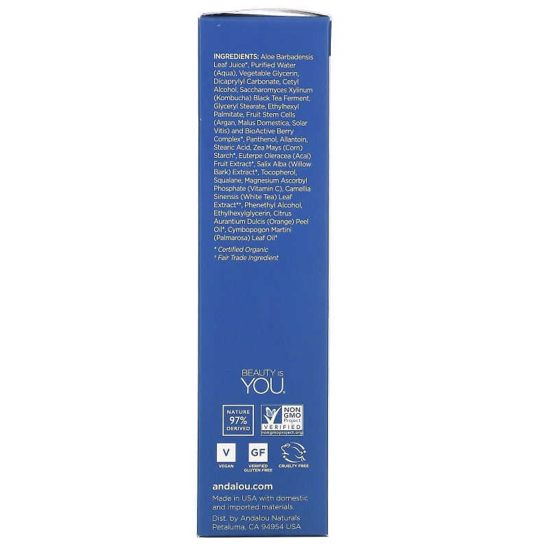 Aloe barbadensis juice*, vegetable glycerin, cyamopsis tetragonolobus (guar) gum*, octyl palmitate, saccharomyces xylinum (kombucha) black tea ferment, fruit steam cells (malus domestica, solar vitis) and bioactive 8 berry complex*, zea mays (corn) starch*, euterpe oleracea (acai) and salix alba (willow bark) extracts*, camellia sinensis (white tea) and hibiscus rosa-sinensis extracts*†, magnesium ascorbyl phosphate (vitamin C), vitis vinifera (grape seed) polyphenols, olive squalane, lecithin, tocopherol (vitamin E), allantoin, panthenol, phenethyl alcohol, ethylhexylglycerin, citrus tangerina (tangerine) and cymbopogon martini (palmarosa) oils*.