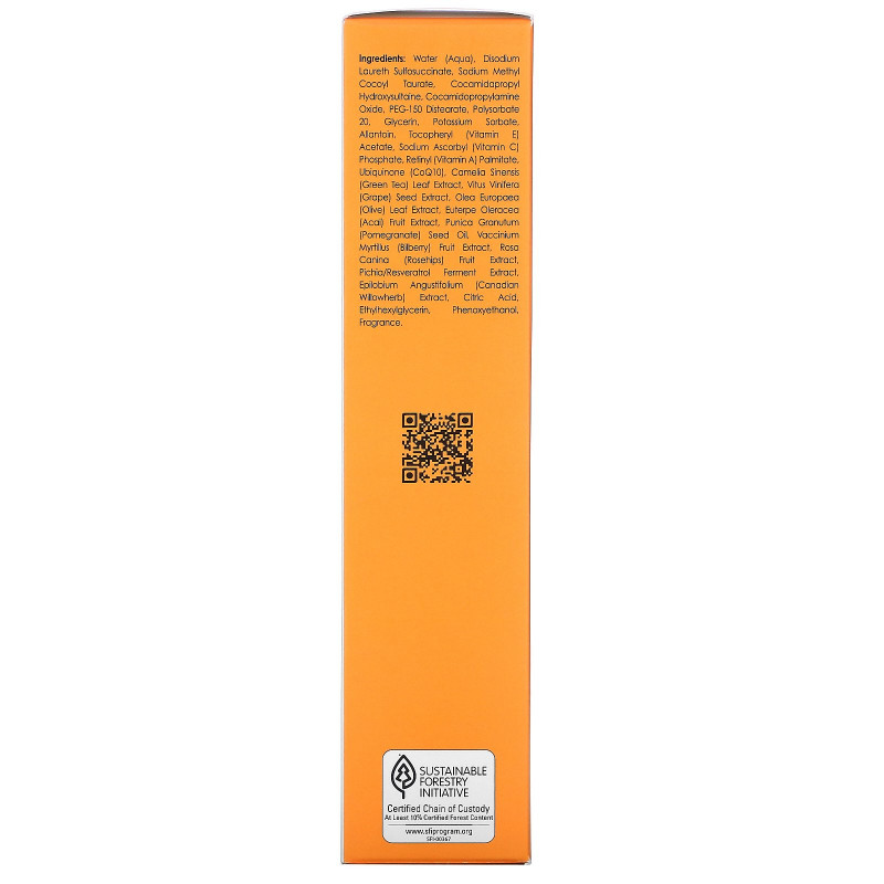 Water (aqua), disodium laureth sulfosuccinate, cocamidopropyl hydroxysultaine, decyl glucoside, polysorbate 20, glyceryl stearate SE, glycerin, PEG-150 distearate, stearic acid, potassium sorbate, allantoin, tocopheryl (vitamin E) acetate, calcium ascorbate (vitamin C), retinyl (vitamin A) palmitate, ubiquinone (CoQ10), camellia sinensis (green tea) leaf extract, vitis vinifera (grape seed) seed oil, olea europaea (olive) leaf extract, euterpe oleracea (acai berry) fruit extract, punica granutum (pomegranate) seed oil, vaccinium myrtillus (bilberry) extract, rosa canina (rose hips) fruit extract, pichia/resveratrol ferment extract, epilobium angustifolium (Canadian willowherb) extract, phenoxyethanol, ethylhexylglycerin, fragrance.