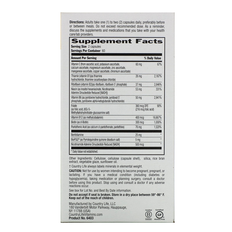 Country Life добавляет в своим продукт уникальный никотинамидадениндинуклеотид в H форме. НАДН — это фермент, присутствующих во всех живых организмах, который поддерживает производство энергии. Так как он добывается из диетического ниацина, он является его собственным оригинальный ферментом.