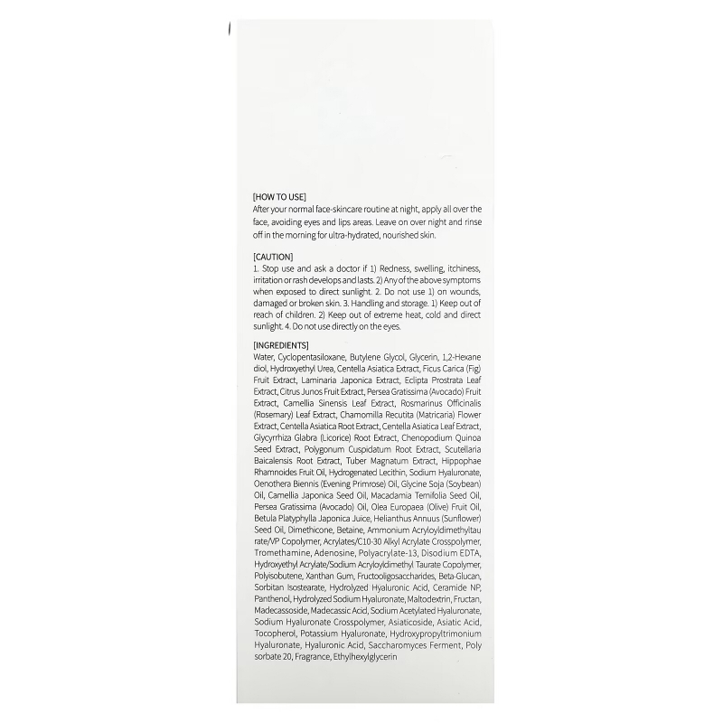 Вода, циклопентасилоксан, бутиленгликоль, глицерин, 1,2-гександиол, гидроксиэтилированная мочевина, экстракт готу колы (Centella asiatica), экстракт плодов инжира (Ficus carica), экстракт ламинарии японской (Laminaria japonica), экстракт листьев эклипты простертой (Eclipta prostrata), экстракт плодов юдзу (Citrus junos), экстракт плодов авокадо (Persea gratissima), экстракт листьев зеленого чая (Camellia sinensis), экстракт листьев розмарина (Rosmarinus officinalis), экстракт цветков ромашки лекарственной (Chamomilla recutita), экстракт корня готу колы (Centella asiatica), экстракт листьев готу колы (Centella asiatica), экстракт корня солодки (Glycyrrhiza glabra), экстракт киноа (Chenopodium quinoa), экстракт корня рейнутрии японской (Polygonum cuspidatum), экстракт корня шлемника (Scutellaria baicalensis), экстракт белого трюфеля (Tuber magnatum), масло из плодов облепихи крушиновидной (Hippophae rhamnoides), гидрогенизированный лецитин, гиалуронат натрия, масло примулы вечерней (Oenothera biennis), соевое масло (Glycine soja), масло из семян камелии японской (Camellia japonica), масло макадамии (Macadamia ternifolia), масло авокадо (Persea gratissima), оливковое масло (Olea europaea), сок березы плосколистной (Betula platyphylla japonica), подсолнечное масло (Helianthus annuus), диметикон, бетаин, аммоний акрилоилдиметилтаурат/ВП сополимер, акрилат/c10-30 алкил акрилат кроссполимер, трометамин, аденозин, полиакрилат-13, двунатриевая ЭДТК, гидроксиэтил акрилат/натрия акрилоилдиметилтаурата сополимер, полиизобутен, ксантановая камедь, фруктоолигосахариды, бета-глюкан, сорбитан изостеарат, гидролизованная гиалуроновая кислота, керамид NP, пантенол, гидролизованный гиалуронат натрия, мальтодекстрин, фруктан, мадекассосид, мадекассовая кислота, ацетилированный гиалуронат натрия, гиалуронат натрия кроссполимер, азиатикозид, азиатиковая кислота, токоферол, гиалуронат калия, гиалуронат гидроксипропилтримония, гиалуроновая кислота, фермент сахаромицетов, поли сорбат 20, отдушка, этилгексилглицерин.