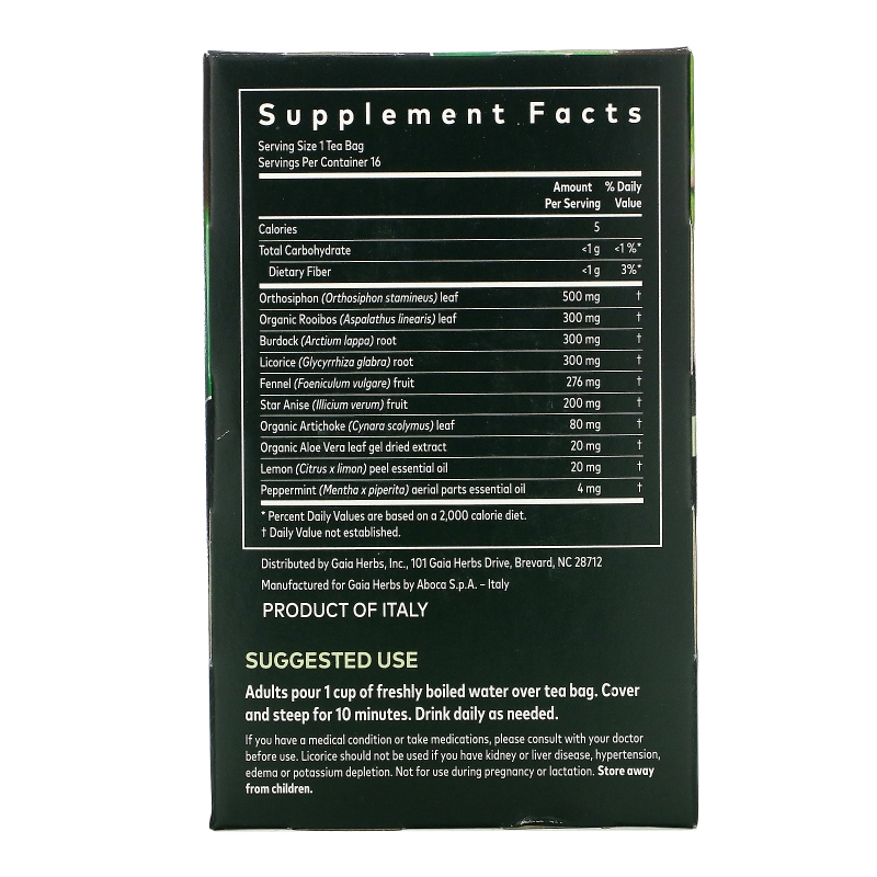 Cleanse & Detox Herbal Tea is produced in Tuscany, Italy by Aboca, the herbal supplement leader in more than 25,000 European pharmacies and health food stores since 1978. Gaia herbs' partnership with Aboca is born from a mutual belief in sustainable product development dedication to quality, and a deep respect for science and nature working in harmony.
