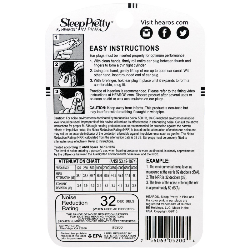 Описание добавки Hearos, Ear Plugs, Sleep Pretty in Pink, 14 Pair
