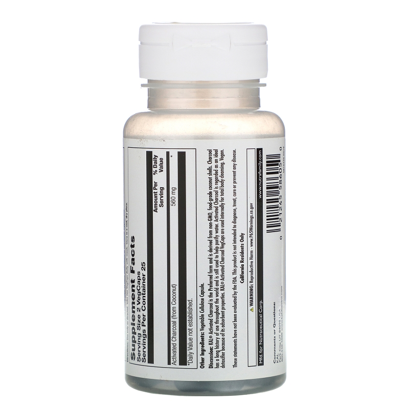 Описание добавки KAL, Активированный уголь, 280 мг, 50 капсул с оболочкой из ингредиентов растительного происхождения
