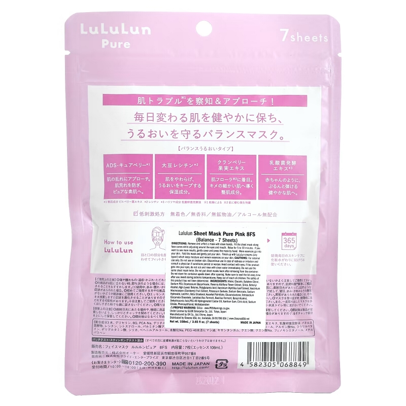 Lululun, Pure Beauty Face Mask, Balance Pink 8FS, 7 Sheets, 3.65 fl oz (108 ml)