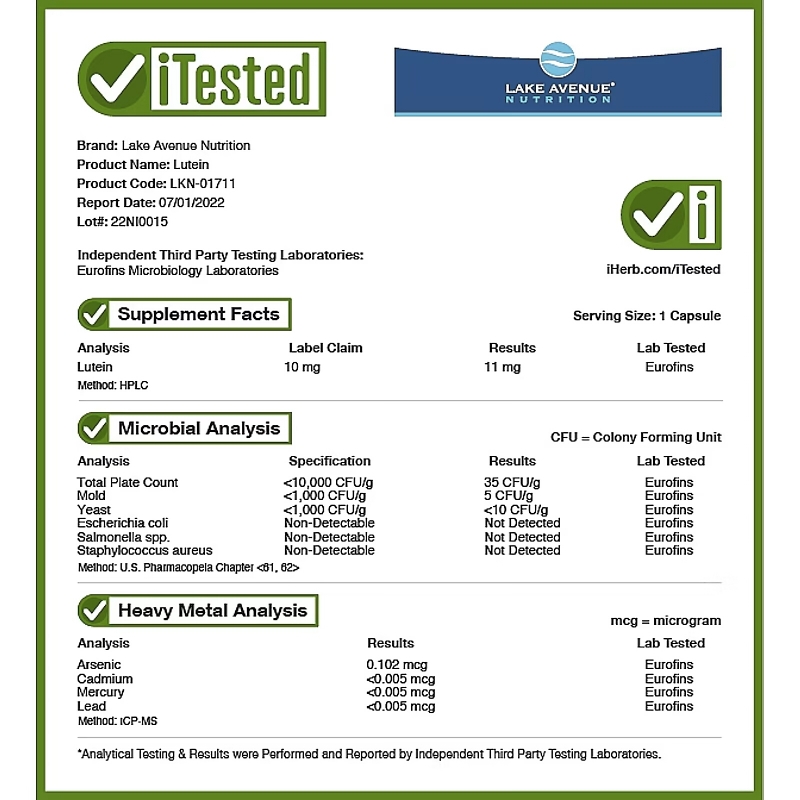 Описание добавки Lake Avenue Nutrition, Lutein, 10 mg, 180 Veggie Capsules