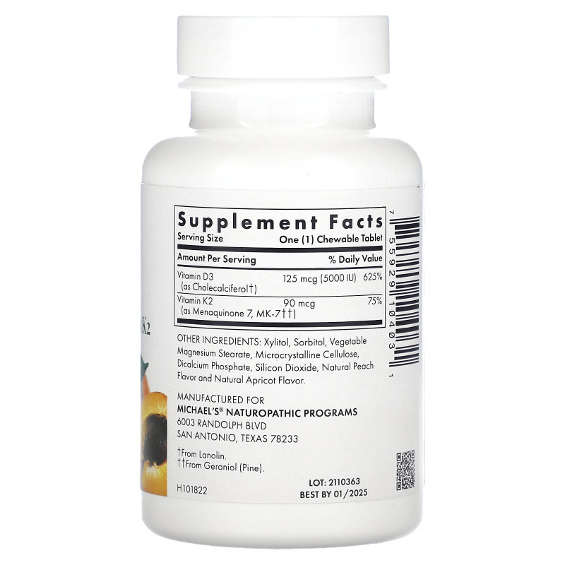 Купить Michael's Naturopathic, Витамин D3, с витамином K2, натуральным абрикосовым вкусом, 5000 ИЕ, 90 жевательных таблеток – цена 4770 ₽, заказать с доставкой в Новосибирск | Интернет-магазин novosibirsk.fakeoff.ru