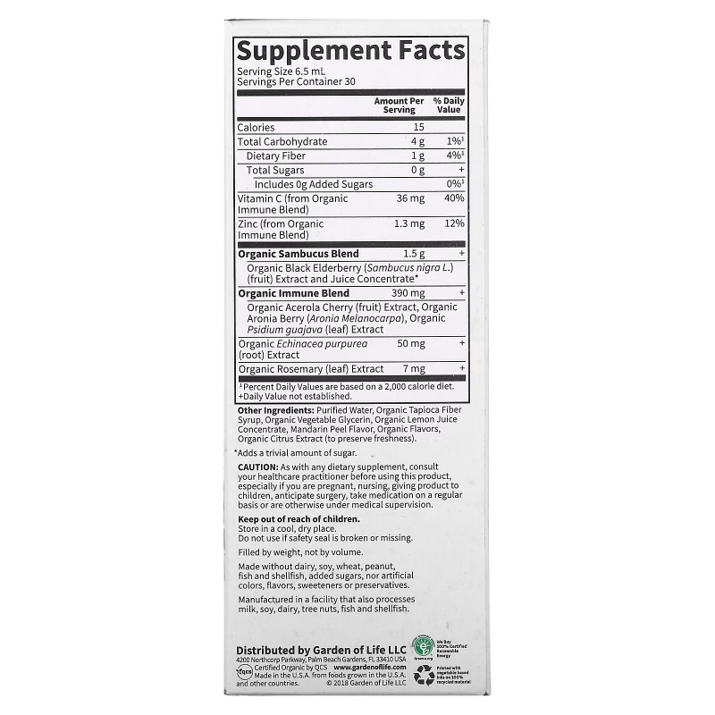 Organic tapioca fiber syrup, organic vegetable glycerin from non-GMO corn, purified water, organic elderberry flavor, organic lemon juice concentrate, mandarin peel flavor, organic citrus extract (to preserve freshness).