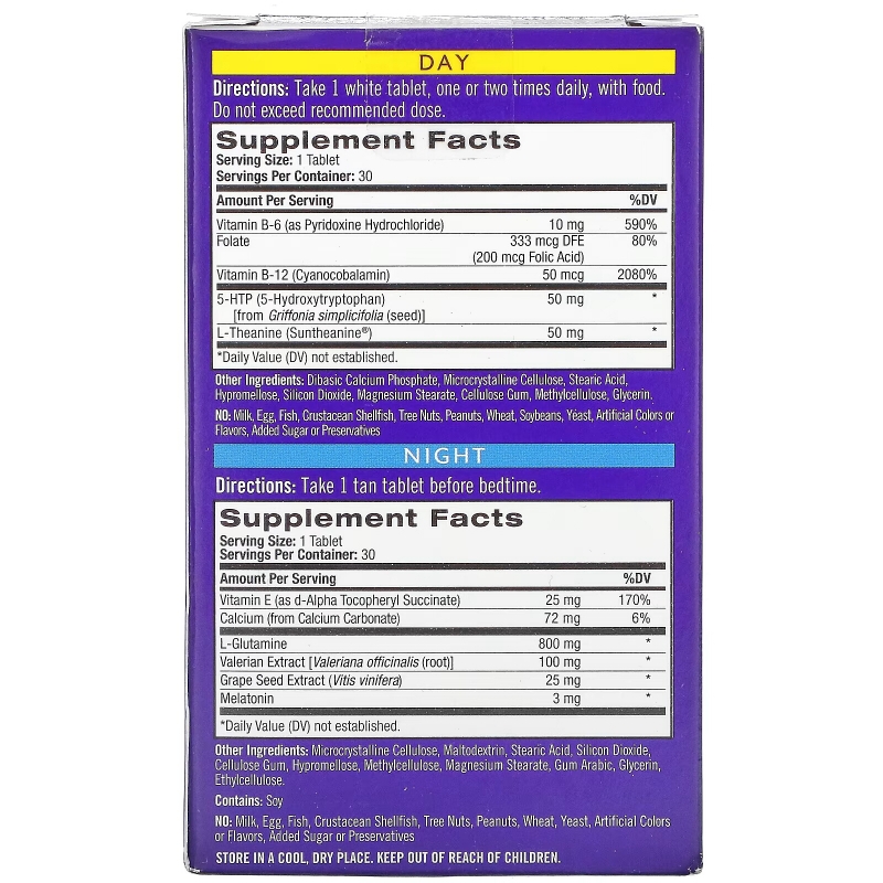 Day - Natrol Stress & Anxiety consists of two separate blends to meet your daytime vs. nighttime needs. The daytime formula promotes calm and relaxation during the day.