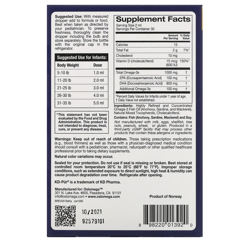 Купить Oslomega, Norwegian Baby’s DHA with Vitamin D3, 800 mg, 2 fl oz (60 ml) – цена 3760 ₽, заказать с доставкой в Новосибирск | Интернет-магазин novosibirsk.fakeoff.ru