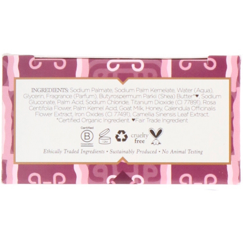 В насыщенное мыло с козьим молоком и экстрактами розы добавлен мед, который смягчает кожу. Мягкая вяжущая розовая вода, действуя совместно с незаменимыми жирными кислотами, содержащимися в козьем молоке, очищает, помогает регулировать рН, ухаживает за кожей и смягчает ее. Мелко молотый чай и лепестки роз обеспечивают легкий пилинг и натуральную антиоксидантную защиту.