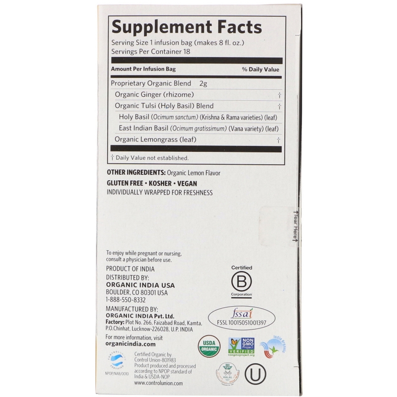 Organic India Чай тулси с ароматом лимона и имбиря в пакетиках, для снятия стресса, без кофеина 18 бумажных пакетиков 1.27 унций (36 г)