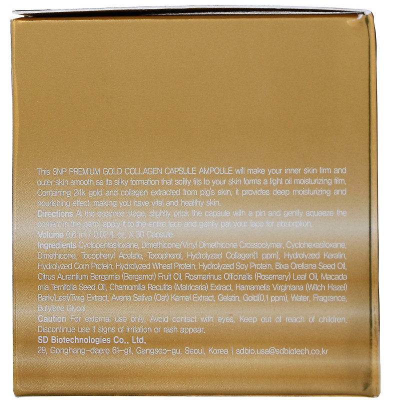 This SNP Premium Gold Collagen Capsule Ampoule will make your inner skin firm and outer skin smooth as its silky formation that softly fits to your skin forms to a light oil moisturizing film. Containing 24k gold and collagen extracted from pig's skin, it provides deep moisturizing and nourishing effect, making you have vital and healthy skin.