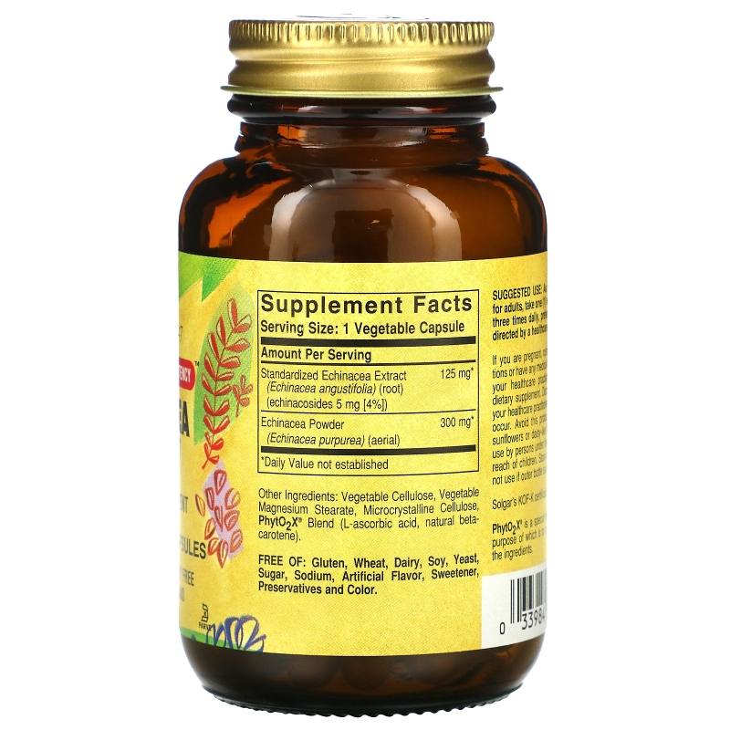 Solgar's Echinacea Herb Extract Vegetable Capsules are free of sugar, salt, corn, yeast, wheat, soy, gluten, dairy and animal products and are formulated without the use of artificial preservatives, flavors or colors.