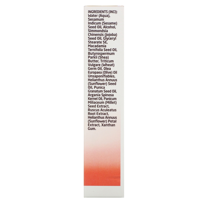 (INCI): Water (aqua), sesamum indicum (sesame) seed oil, alcohol, simmondsia chinensis (jojoba) seed oil, glyceryl stearate SE, macadamia ternifolia seed oil, butyrospermum parkii (shea butter), triticum vulgare (wheat) germ oil, olea europaea (olive) oil unsaponifiables, helianthus annuus (sunflower) seed oil, punica granatum seed oil, argania spinosa kernel oil, panicum miliaceum (millet) seed extract, ruscus aculeatus root extract, helianthus annuus (sunflower) petal extract, xanthan gum.